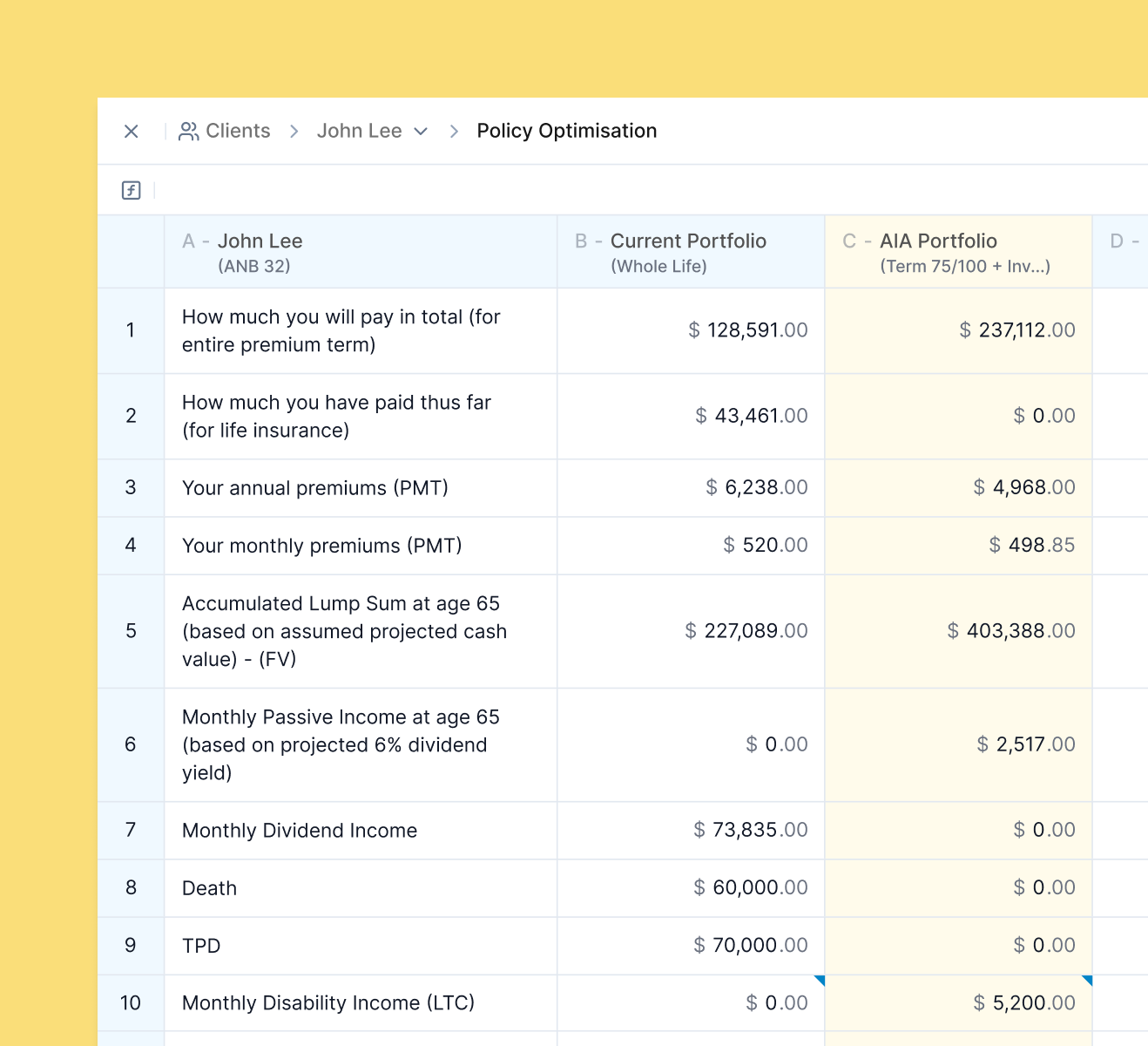 The Math. The system automatically tabulates the differences in coverage gaps and premiums. Your client sees exactly how much more value they get with your recommendation versus what they have now.