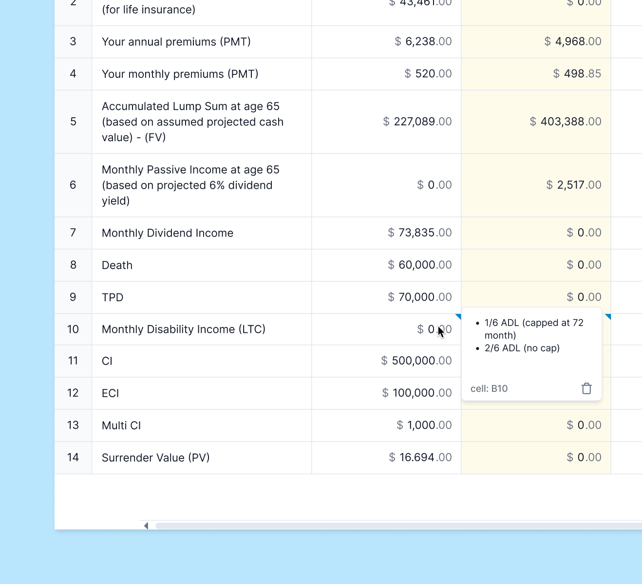 Building custom formulas to sum up coverage across different policies and insurers.